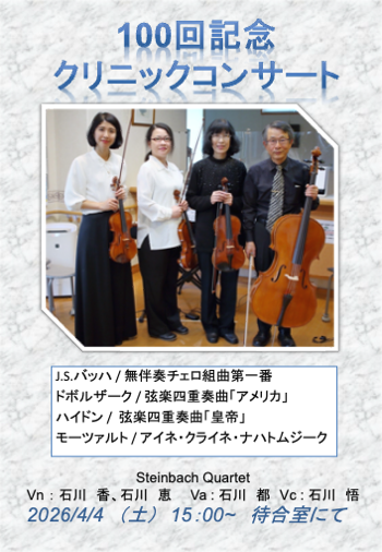 | 当院では月に1度、院内でコンサートを開催しています。 45分程度で入場無料ですので、どなた様もお気軽にお越しください。 |